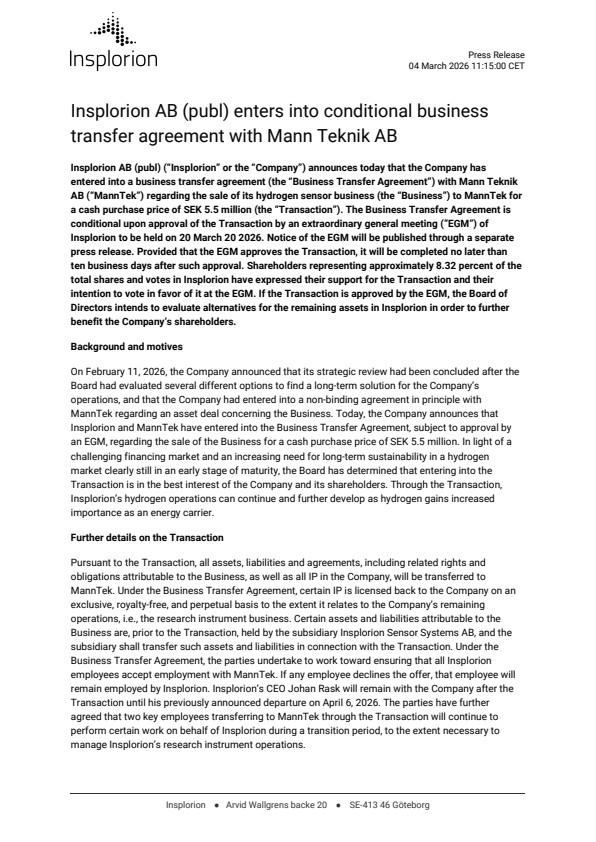 Insplorion AB (publ) (“Insplorion” or the “Company”) announces today that the Company has entered into a business transfer agreement (the “Business Transfer Agreement”) with Mann Teknik AB (“MannTek”) regarding the sale of its hydrogen sensor business (the “Business”) to MannTek for a cash purchase price of SEK 5.5 million (the “Transaction”). The Business Transfer Agreement is conditional upon approval of the Transaction by an extraordinary general meeting (”EGM”) of Insplorion to be held on 20 March 20 2026. Notice of the EGM will be published through a separate press release. Provided that the EGM approves the Transaction, it will be completed no later than ten business days after such approval. Shareholders representing approximately 8.32 percent of the total shares and votes in Insplorion have expressed their support for the Transaction and their intention to vote in favor of it at the EGM. If the Transaction is approved by the EGM, the Board of Directors intends to evaluate alternatives for the remaining assets in Insplorion in order to further benefit the Company’s shareholders.
