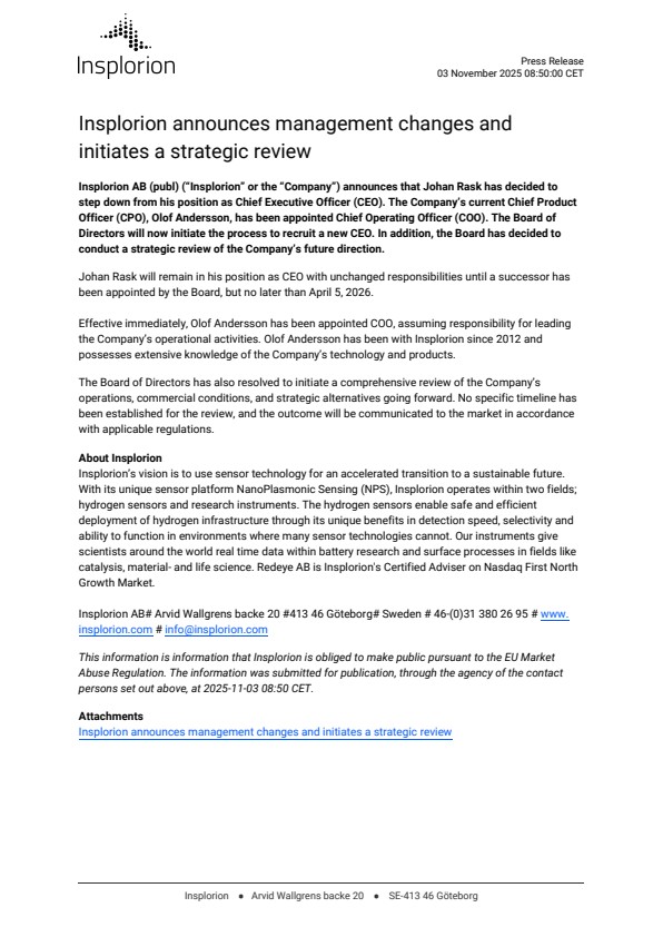 Insplorion AB (publ) (“Insplorion” or the “Company”) announces that Johan Rask has decided to step down from his position as Chief Executive Officer (CEO). The Company’s current Chief Product Officer (CPO), Olof Andersson, has been appointed Chief Operating Officer (COO). The Board of Directors will now initiate the process to recruit a new CEO. In addition, the Board has decided to conduct a strategic review of the Company’s future direction.