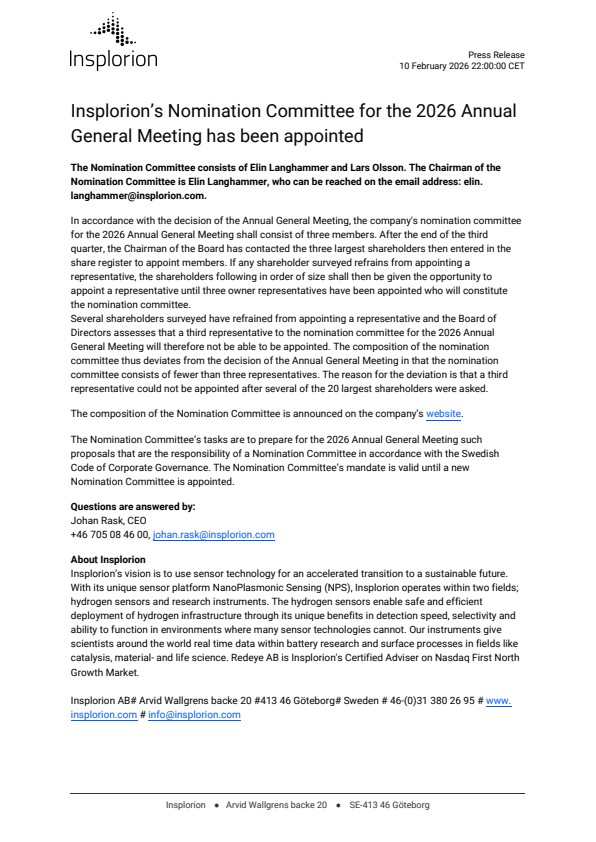 Insplorion’s Nomination Committee for the 2026 Annual General Meeting has been appointed