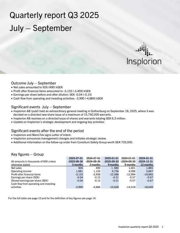 - Insplorion AB (publ) held an extraordinary general meeting in Gothenburg on September 18, 2025, where it was decided on a directed new share issue of a maximum of 15,750,000 warrants.