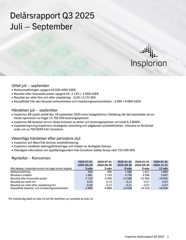 - Insplorion AB (publ) avhöll den 18 september 2025 extra bolagstämma i Göteborg där det beslutades om en riktad nyemission av högst 15 750 000 teckningsoptioner.