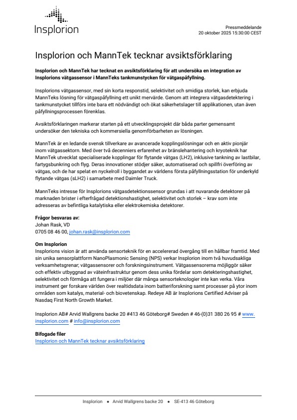 Insplorion och MannTek har tecknat en avsiktsförklaring för att undersöka en integration av Insplorions vätgassensor i MannTeks tankmunstycken för vätgaspåfyllning.