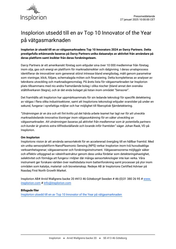 Darcy Partners är ett amerikanskt företag som erbjuder sina över 10 000 medlemmar från företag inom olja, gas och energi en plattform för marknadsinsikter och rådgivning. I deras urvalsprocess identifierar de innovatörer som genererat störst intresse bland energibolag, mätt genom parametrar som visningar, klick, följare, schemalagda möten och finansiering. Detta kompletteras av analyser av teknikens utveckling och marknadsgenomslag. På årets lista för vätgasmarknaden tar Insplorion plats tillsammans med nio andra framstående bolag i olika nischer (bland annat den svenska ståltillverkaren Stegra), och är det enda bolaget på listan inom området ”Sensorer”.