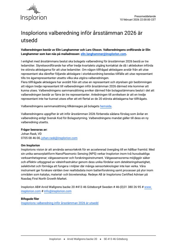 Insplorions valberedning inför årsstämman 2026 är utsedd