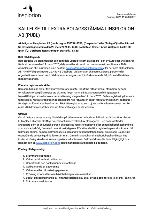 Aktieägarna i Insplorion AB (publ), org.nr 556798-8760, (”Insplorion” eller ”Bolaget”) kallas härmed till extra bolagsstämma den 20 mars 2026 kl. 14.00 på Biotech Center, Arvid Wallgrens backe 20 (plan 7), i Göteborg. Registreringen startar kl. 13.30.