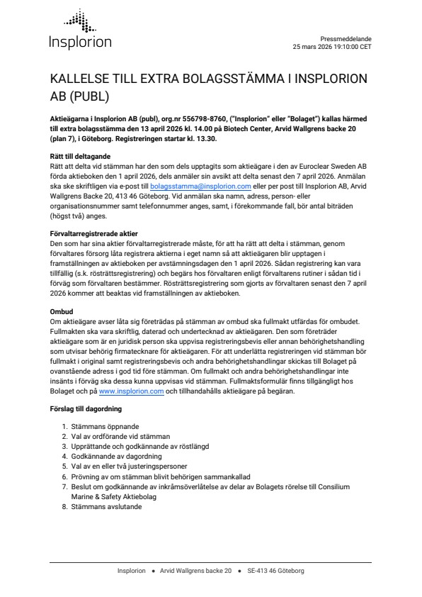 Aktieägarna i Insplorion AB (publ), org.nr 556798-8760, (”Insplorion” eller ”Bolaget”) kallas härmed till extra bolagsstämma den 13 april 2026 kl. 14.00 på Biotech Center, Arvid Wallgrens backe 20 (plan 7), i Göteborg. Registreringen startar kl. 13.30.