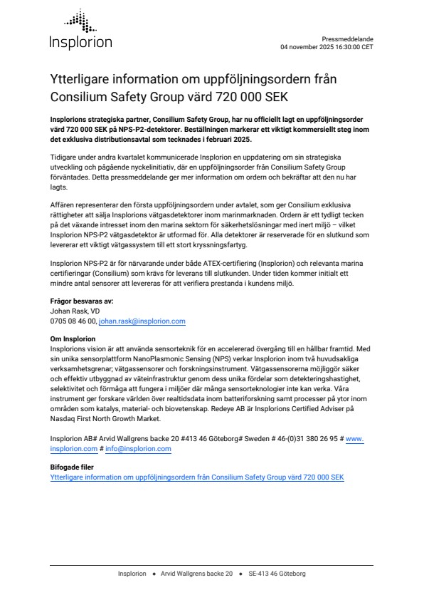 Affären representerar den första uppföljningsordern under avtalet, som ger Consilium exklusiva rättigheter att sälja Insplorions vätgasdetektorer inom marinmarknaden. Ordern är ett tydligt tecken på det växande intresset inom den marina sektorn för säkerhetslösningar med inert miljö – vilket Insplorion NPS-P2 vätgasdetektor är utformad för. Alla detektorer är reserverade för en slutkund som levererar ett viktigt vätgassystem till ett stort kryssningsfartyg.